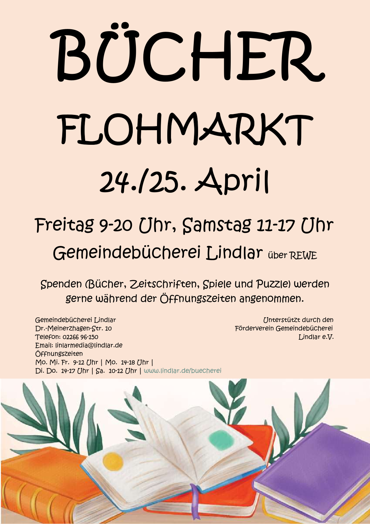 Am 24. und 25. April, bei langen Öffnungszeiten, lädt die Gemeindebücherei Lindlar wieder zum Bücherflohmarkt ein! Am Freitag von 9 bis 20 Uhr und am Samstag von 11 bis 17 Uhr werden Romane, Krimis, Kinderbücher, Ratgeber und vieles mehr angeboten – gut erhalten und zu kleinen Preisen. Bitte haben Sie Verständnis dafür, dass an beiden Flohmarkttagen keine Ausleihe stattfinden kann. Mit jedem Kauf unterstützen Sie die Gemeindebücherei! Der gesamte Erlös aus dem Bücherflohmarkt wird für Neuanschaffungen verwendet. So tragen Sie dazu bei, dass die Gemeindebücherei weiterhin ein attraktives Angebot für die ganze Familie bereithält – Bücher, CDs, Tonies etc. Unterstützen und nachhaltig handeln: „Win-Win“ für Sie und für uns!