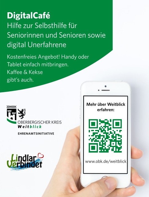 Individuelle Problemeröterungen, Kurzvorträge, Workshops, praktische Tipps, Lern- und Übungseinheiten rund um digitale Belange im DigitalCafé. Ein kostenloses Angebot der Ehrenamtsinitiative Weitblick des Oberbergischen Kreises und den DigitalBegleiter*innen des Projektes Lindlar.digital von Lindlar verbindet e.V. Unsere DigitalBegleiter*innen stehen für Fragen rund um Handy, Tablet oder Laptop zur Verfügung. Bei kniffligen Problemen stärken wir uns zwischendurch mit Kaffee und Keksen. Das Angebot ist kostenfrei! Freies W-Lan steht zur Verfügung. Eigene Laptops, Tablets und Smartphones bitte mitbringen. Anmeldungen unter Telefon 02266 – 4407204 oder info@lindlar-digital.de. Weitere Infos auf der Webseite vom Oberbergischen Kreis: www.obk.de und auf www.lindlar-digital.de