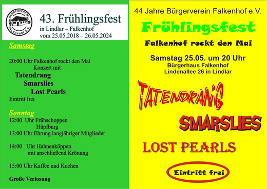 Vom 25.05. ab 14:30 Uhr bis 26.05. ab 11:00 Uhr feiert der Bürgerverein Falkenhof im Bürgerhaus sein traditionelles Frühlingsfest. Mehr Infos unter www.buergerverein-falkenhof.de