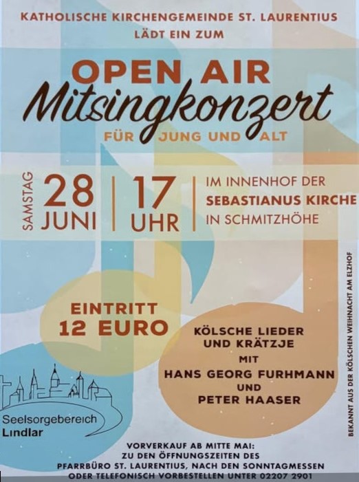 Die katholische Kirchengemeinde St. Laurentius lädt ein. Kölsche Lieder und Krätzje mit Hans Georg Fuhrmann und Peter Haaser. Im Innenhof der Sebastianus Kirche in Lindlar-Schmitzhöhe. Eintritt: 12 EUR. Vorverkauf zu den Öffnungszeiten des Pfarrbüro St. Laurentius, nach den Sonntagsmessen oder telefonisch vorbestellen unter 02207-2901.