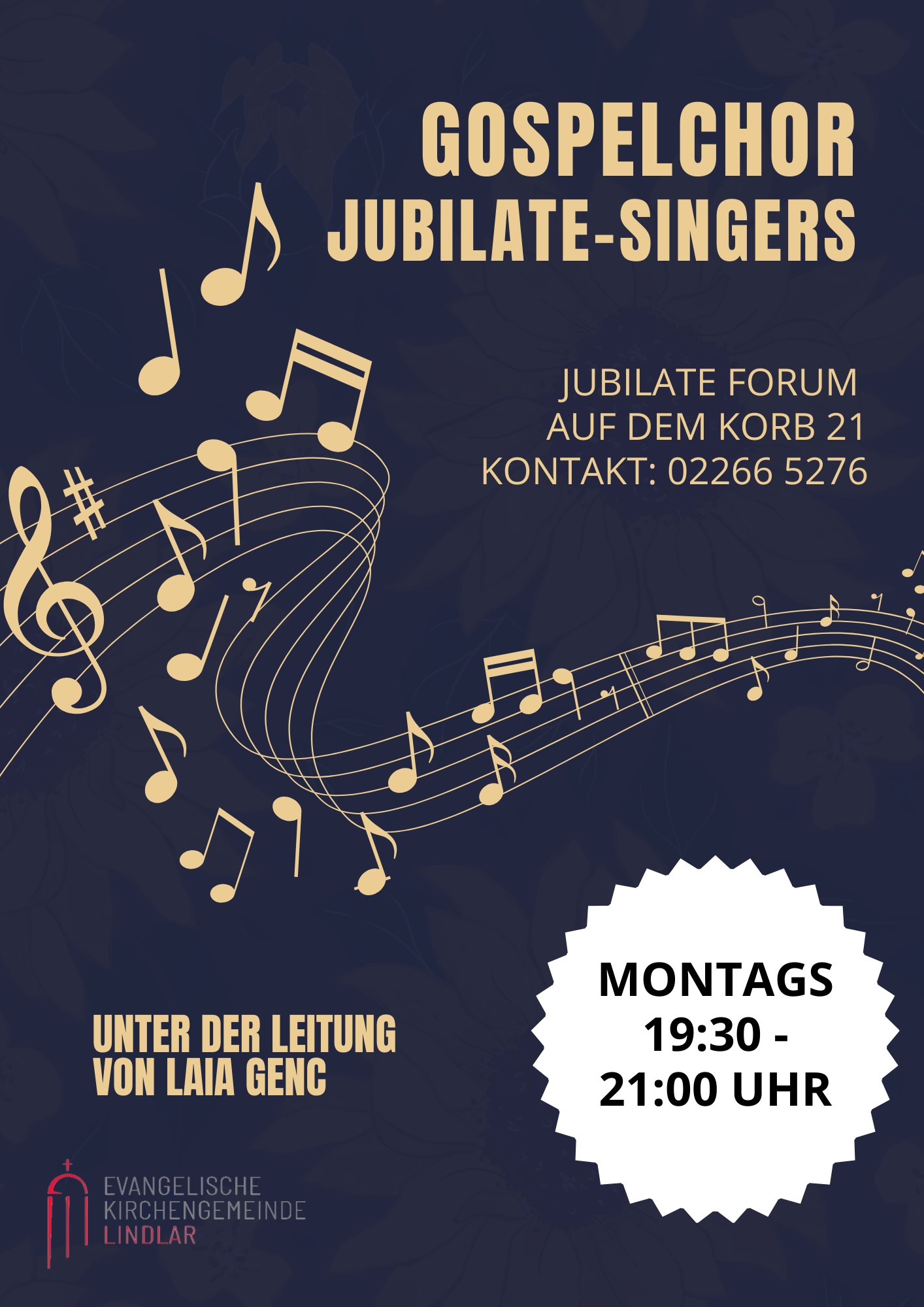 Der Gospelchor der Ev. Kirchengemeinde Lindlar, die Jubilate-Singers, treffen sich unter der Leitung von Laia Genc immer montags von 19.30 – 21.00 Uhr im Jubilate-Forum. Gesungen wird eine lockere Mischung aus Gospel-, Pop- und Jazzarrangements. Interessierte Mitsängerinnen und -sänger sind herzlich willkommen. Kontakt: Marion Ritter, Tel. 02266 4406069 oder marion_susanne.ritter@ekir.de. Weitere Infos über evangelisches Gemeindebüro: 02266-5276 oder per Mail: lindlar@ekir.de Hinweis: In den Schulferienzeiten NRW finden keine Proben statt. Hinweis: In Ferienzeiten und/ oder an Feiertagen kann es zu Abweichungen kommen!