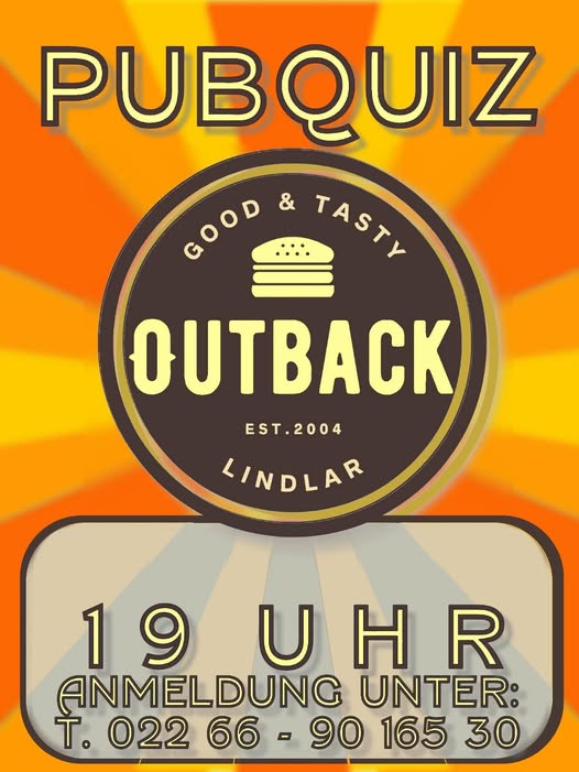 Bist du bereit für einen unvergesslichen Abend voller Spaß, Wissen und Teamgeist? Am 7. August 2025 um 19:00 Uhr verwandelt sich das Outback-Lindlar in eine aufregende Quizarena, und wir laden dich herzlich ein, gemeinsam mit Freunden dabei zu sein!