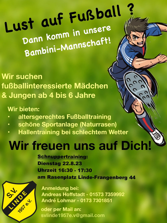 Anmeldung bei: Andreas Hoffstadt 01573 73 599 92; André Lohmar 0173 730 1851 oder per Mail an: svlinde1957e.v@gmail.com