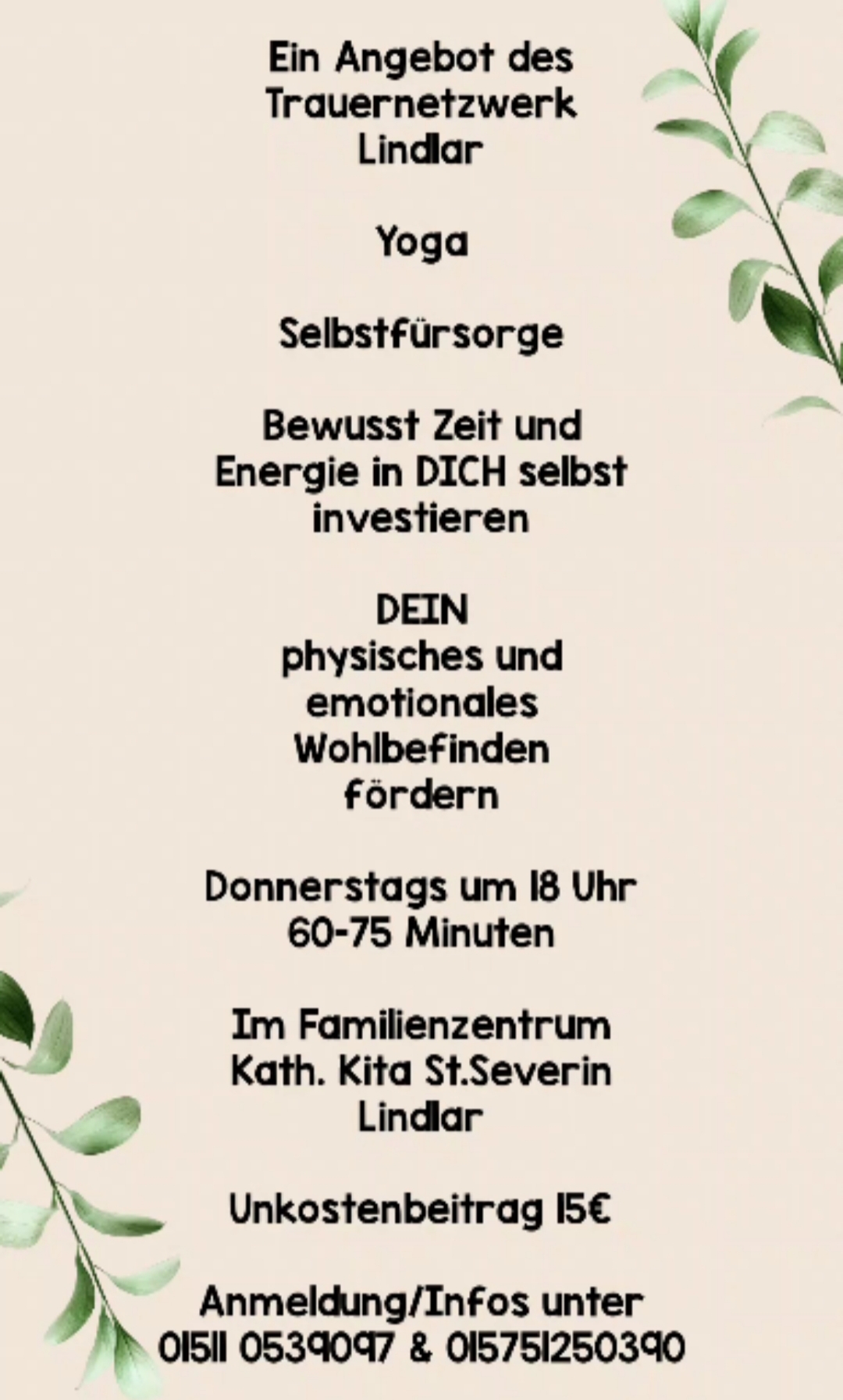 Selbstfürsorge. Bewusst Zeit und Energie in DICH selbst investieren. DEIN physisches und emotionales Wohlbefinden fördern.  Ein Angebot des Trauernetzwerk Lindlar. Donnerstags um 18 Uhr, 60-75 Minuten. Unkostenbeitrag 15€. Im Familienzentrum Kath. Kita St. Severin. Anmeldungen und Informationen: C. Kiesewetter 01511 0539097 und be you – K. Elbers 01575 1250390.